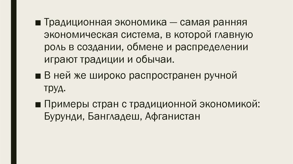 ■ Традиционная экономика — самая ранняяэкономическая система, в которой главную
