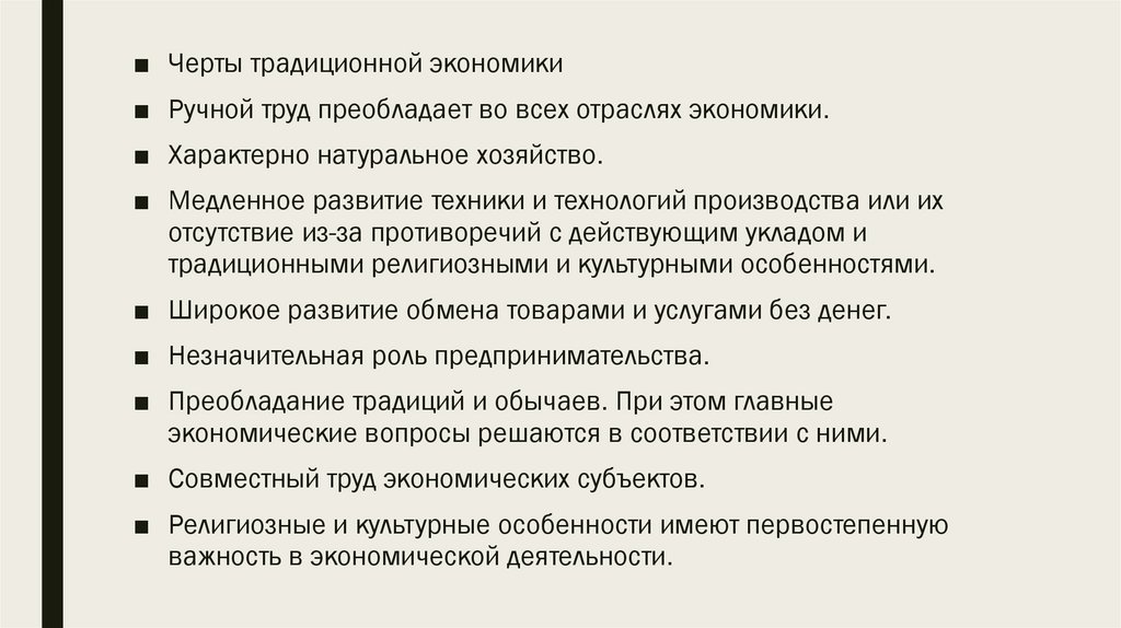■ Черты традиционной экономики■ Ручной труд преобладает во всех отраслях экономики.
