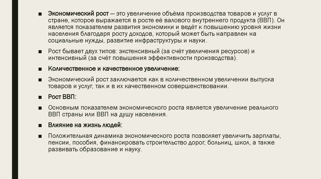 ■ Экономический рост — это увеличение объёма производства товаров и услуг встране, которое выражается в росте её валового внутреннего продукта (ВВП). Он
