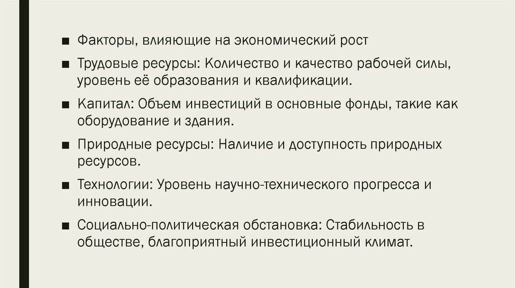 ■ Факторы, влияющие на экономический рост■ Трудовые ресурсы: Количество и качество рабочей силы,