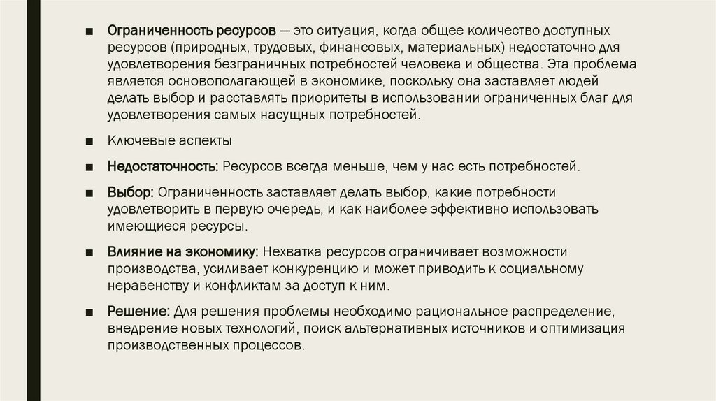 ■ Ограниченность ресурсов — это ситуация, когда общее количество доступныхресурсов (природных, трудовых, финансовых, материальных) недостаточно для