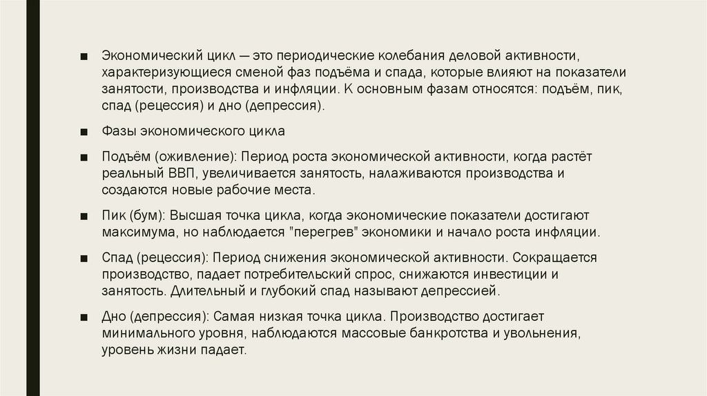 занятости, производства и инфляции. К основным фазам относятся: подъём, пик,