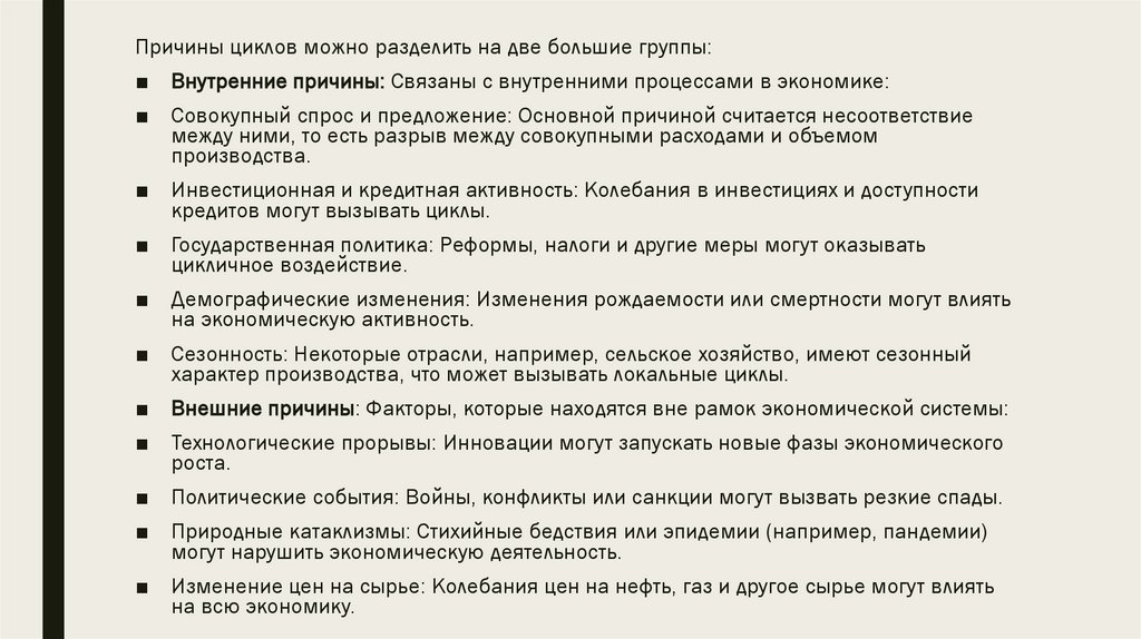 Причины циклов можно разделить на две большие группы:■ Внутренние причины: Связаны с внутренними процессами в экономике: