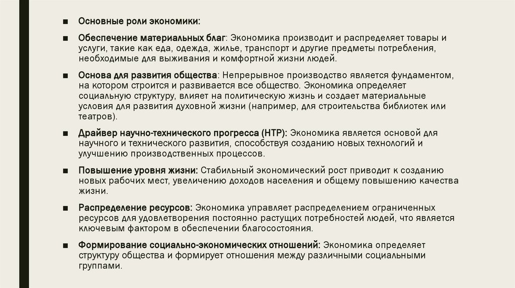 ■ Основные роли экономики:■ Обеспечение материальных благ: Экономика производит и распределяет товары и
