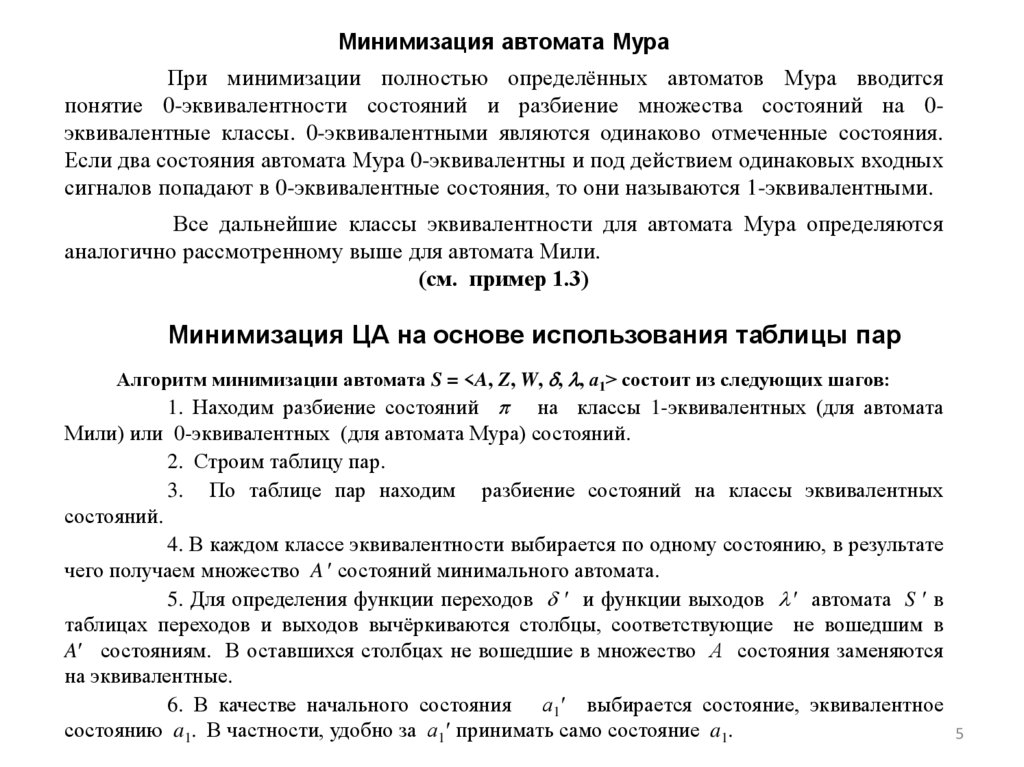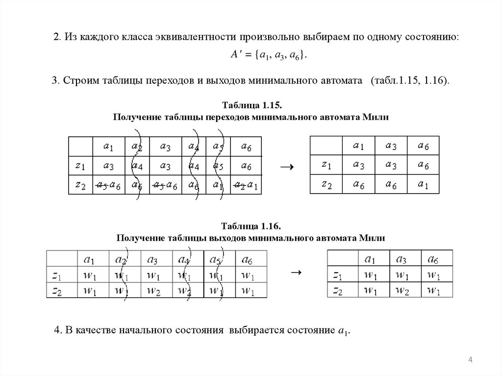 Алгоритм минимизации автомата S = <A, Z, W, , , а1> состоит из следующих шагов: