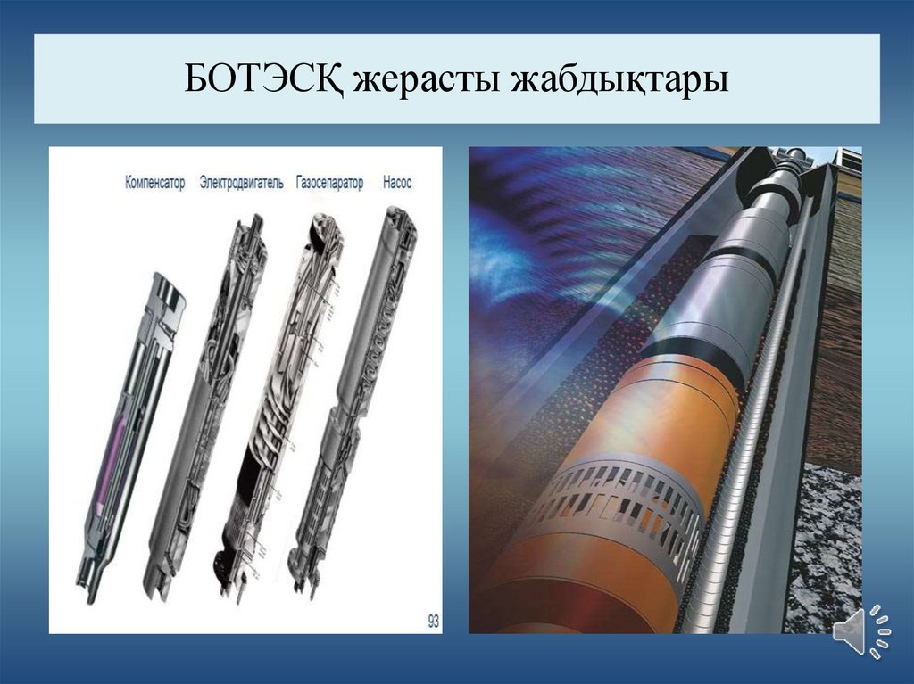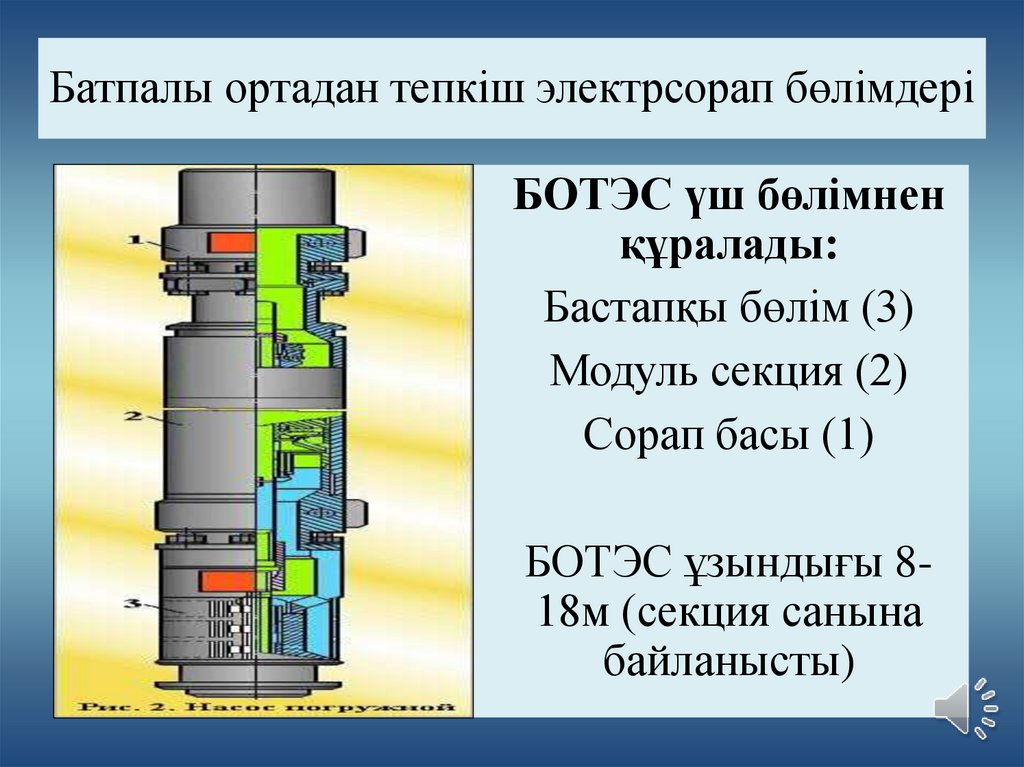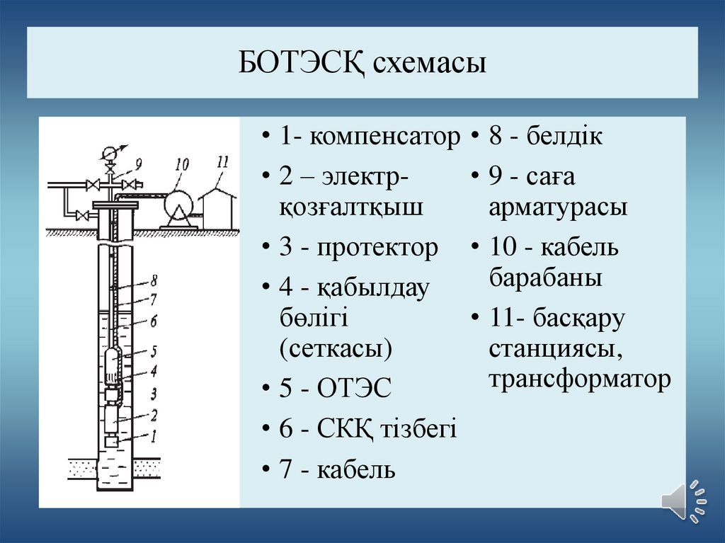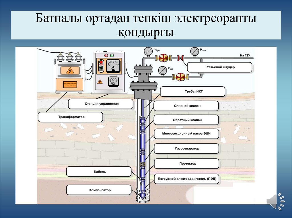 тепкіш электр сорап, гидро қорғаныс (протектор және компенсатор), электрқозғалтқыш, кері және ағызу клапандары, сораптыкомпрессорлық құбырлар тізбегі, бекіту
