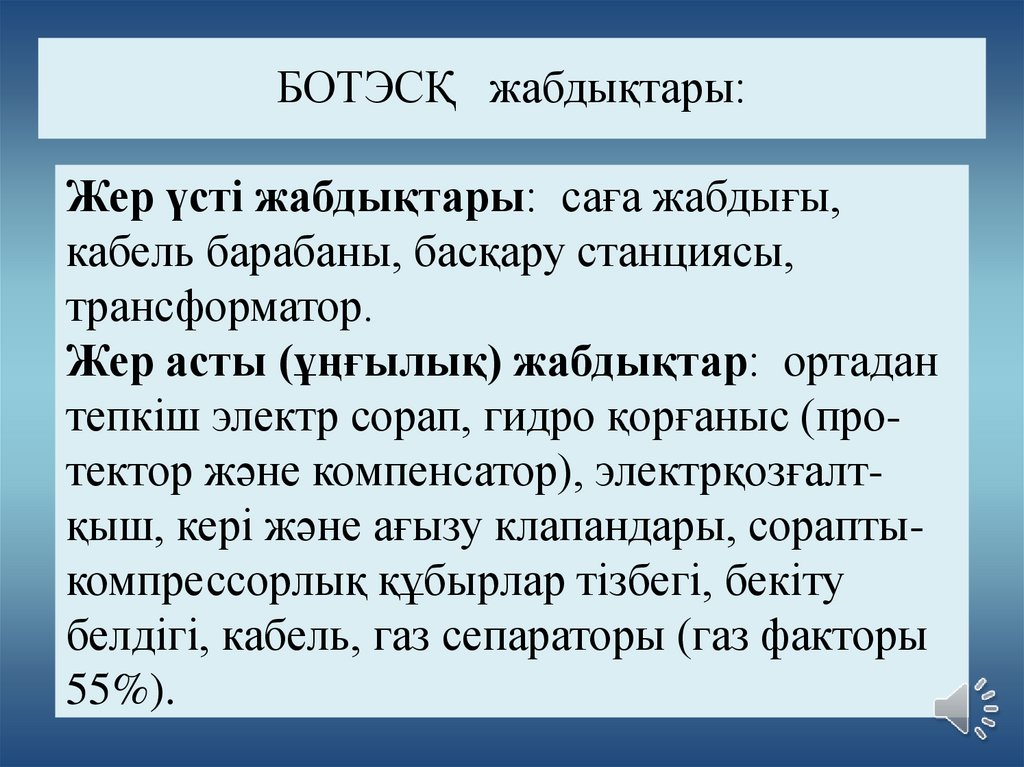 БОТЭСҚ жабдықтары:Жер үсті жабдықтары: саға жабдығы,