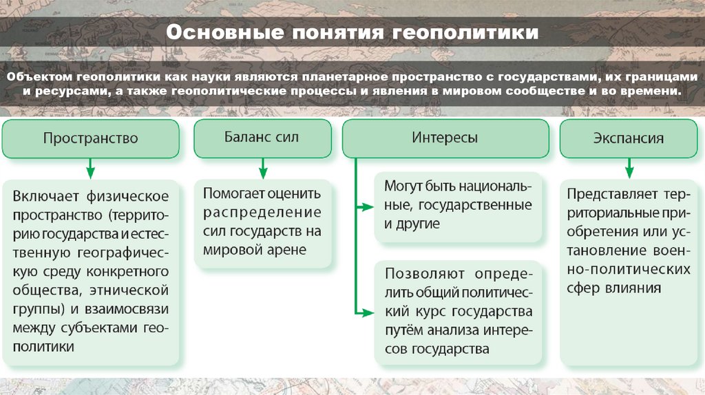 Основные понятия геополитикиОбъектом геополитики как науки являются планетарное пространство с государствами, их границами