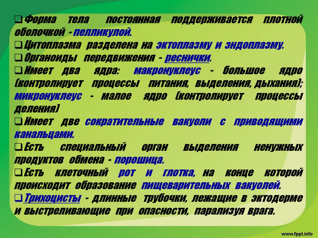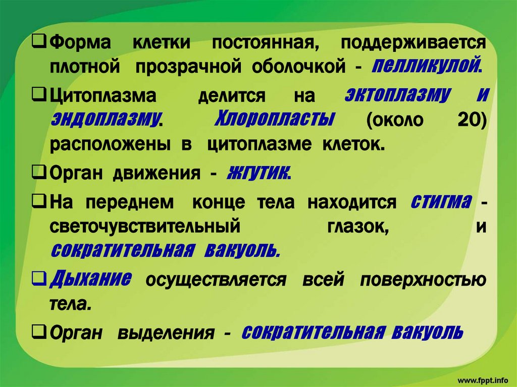 Форма клетки постоянная, поддерживаетсяплотной прозрачной оболочкой - пелликулой.