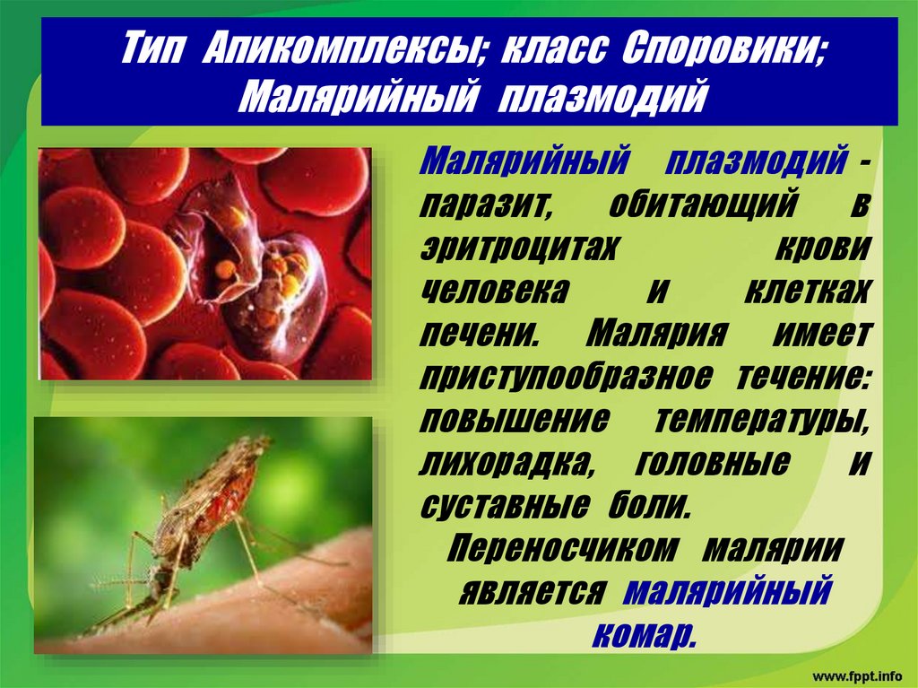 Тип Апикомплексы; класс Споровики;Малярийный плазмодий