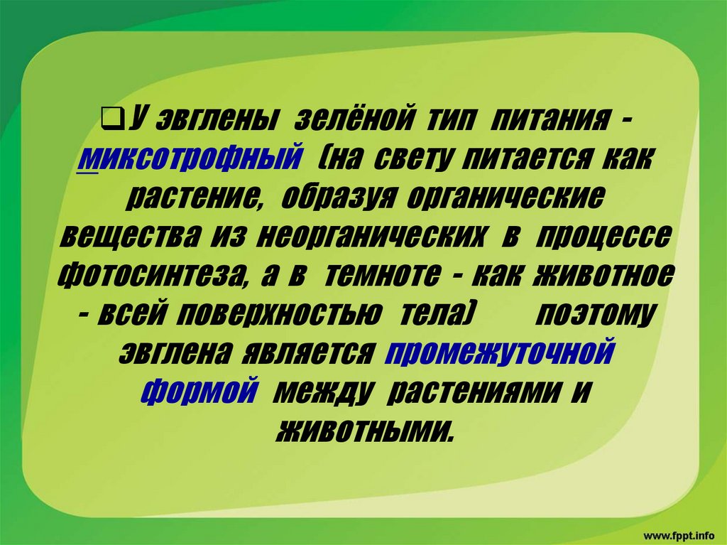 У эвглены зелёной тип питания -миксотрофный (на свету питается как