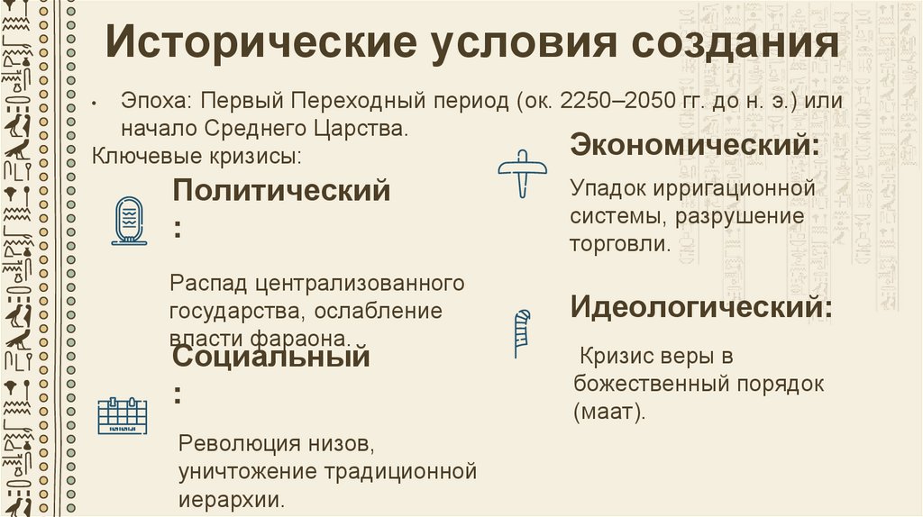 Исторические условия созданияЭпоха: Первый Переходный период (ок. 2250–2050 гг. до н. э.) или