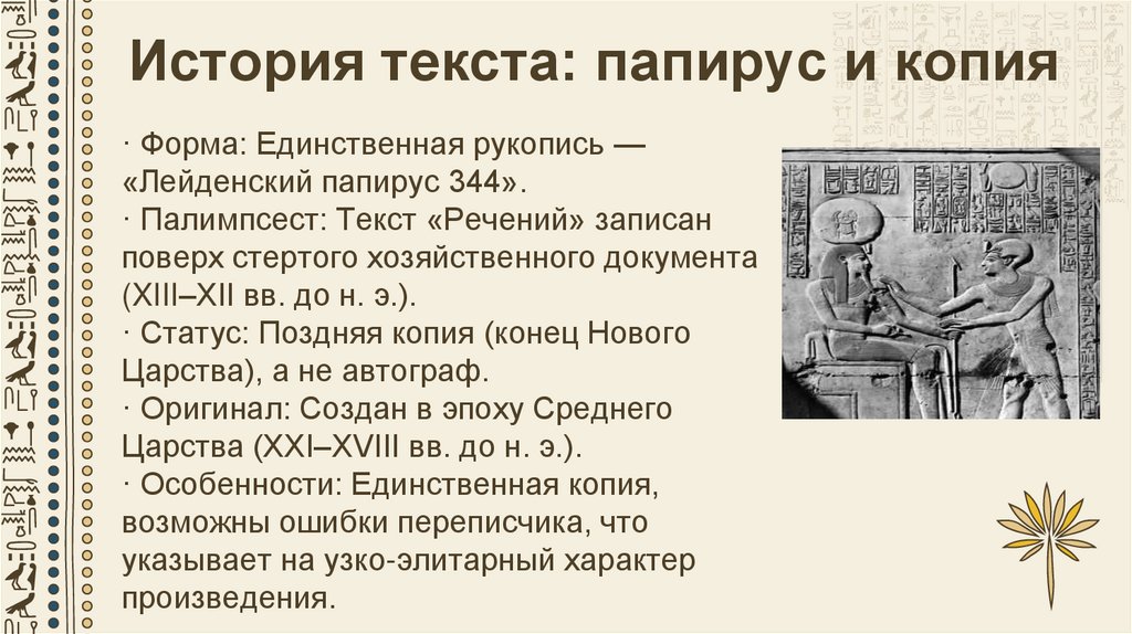 История текста: папирус и копия· Форма: Единственная рукопись —
