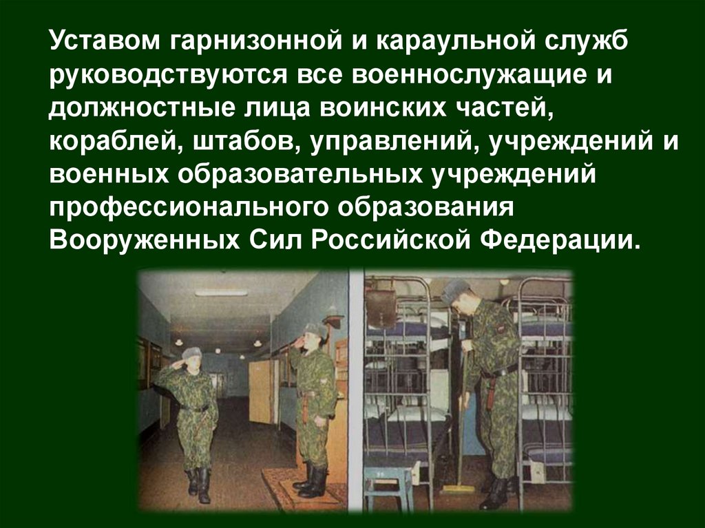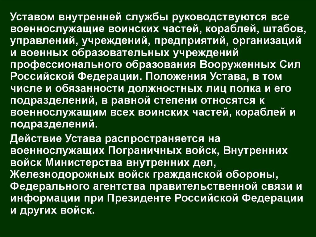 Уставом внутренней службы руководствуются всевоеннослужащие воинских частей, кораблей, штабов,