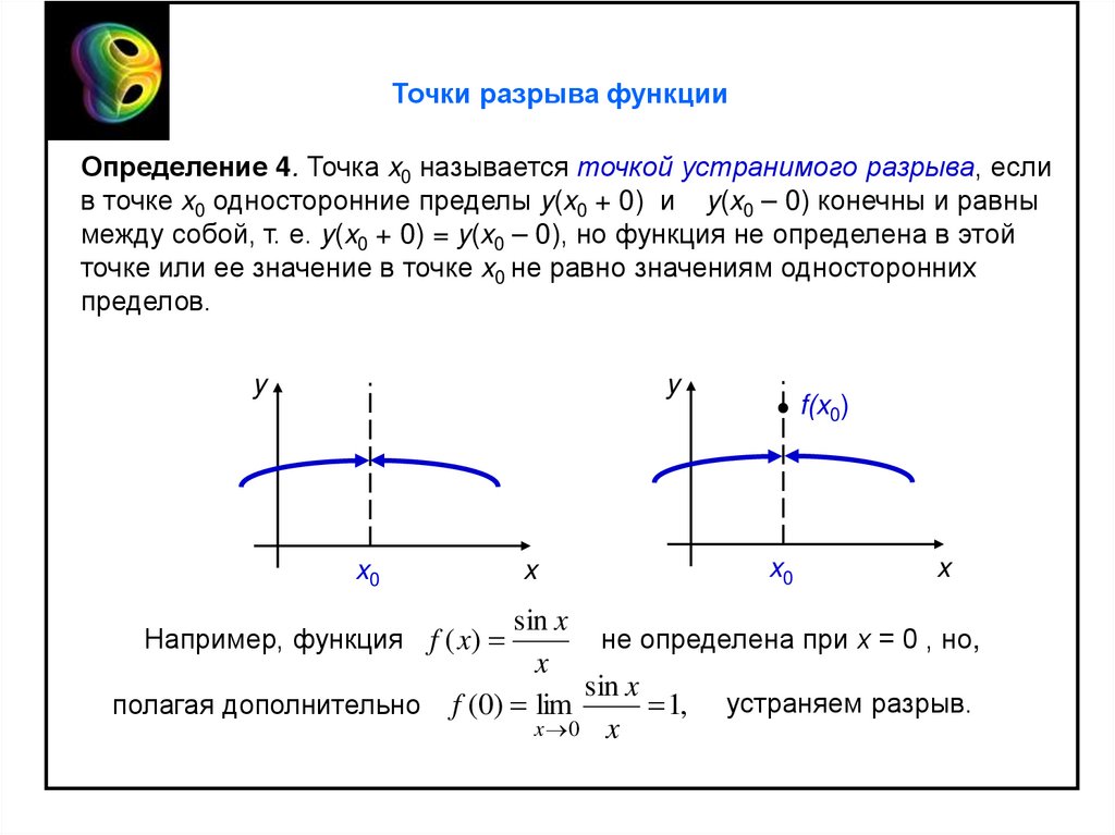 Точки разрыва функцииОпределение 4. Точка x0 называется точкой устранимого разрыва, если