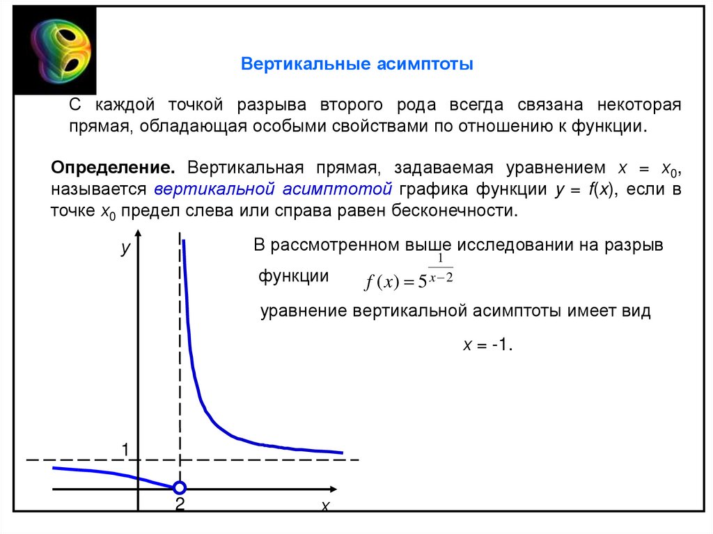Вертикальные асимптотыС каждой точкой разрыва второго рода всегда связана некоторая