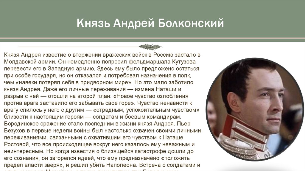 Князь Андрей БолконскийКнязя Андрея известие о вторжении вражеских войск в Россию застало в