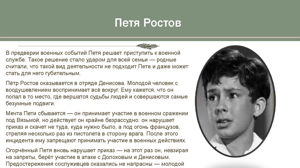 Петя РостовВ предверии военных событий Петя решает приступить к военной