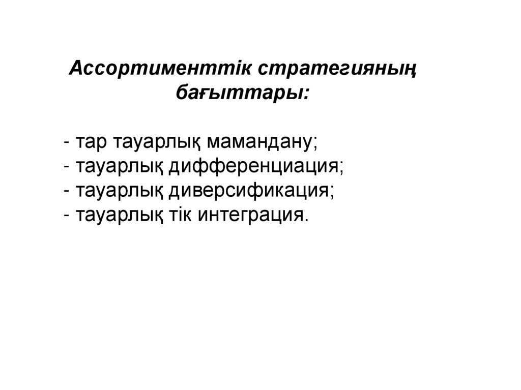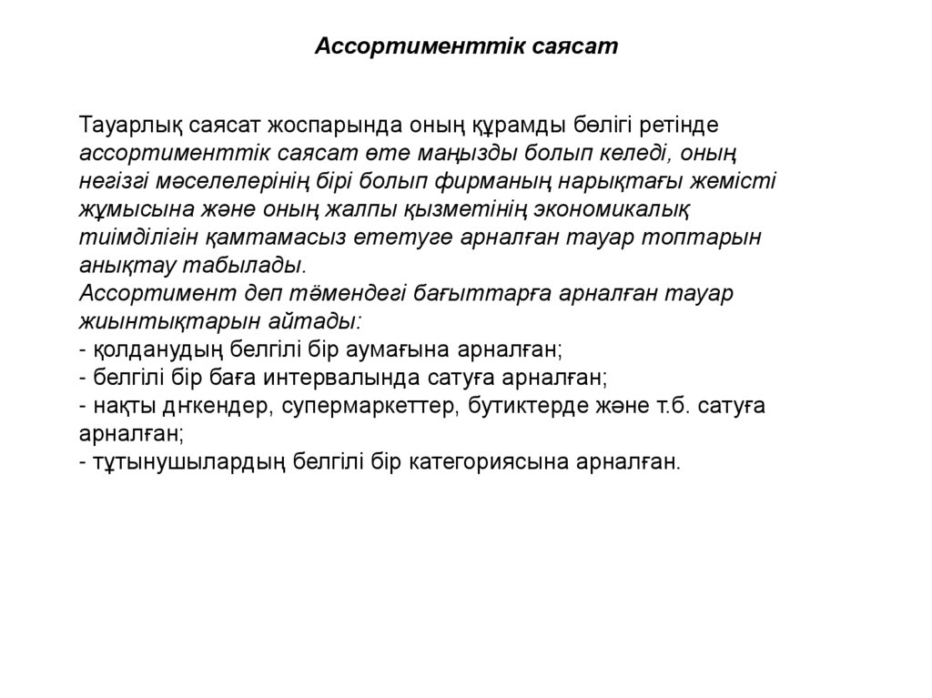 Ассортименттік саясатТауарлық саясат жоспарында оның құрамды бөлігі ретінде