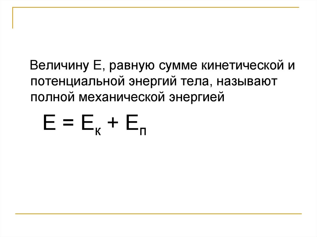 Величину Е, равную сумме кинетической ипотенциальной энергий тела, называют