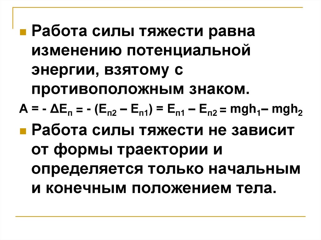 А = - ΔЕп = - (Еп2 – Еп1) = Еп1 – Еп2 = mgh1– mgh2