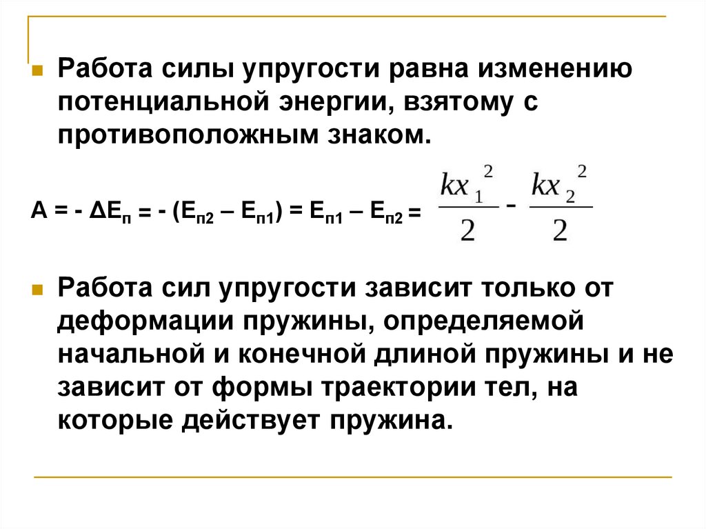 Работа силы упругости равна изменениюпотенциальной энергии, взятому с