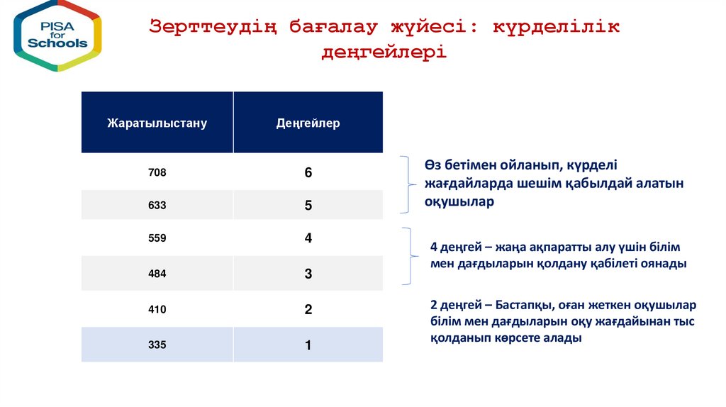 4. PISA ХАЛЫҚАРАЛЫҚ ЗЕРТТЕУЛЕРДЕГІ 15 жасар оқушылардың оқу жетістіктерінің алты деңгейі