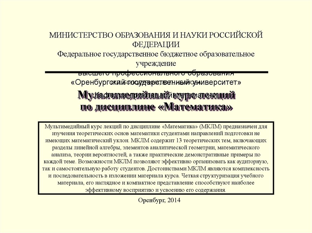 Мультимедийный курс лекций по дисциплине «Математика» (МКЛМ) предназначен для