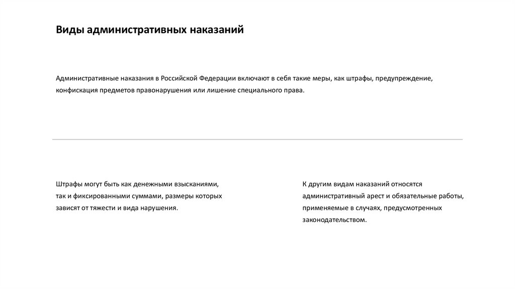 Виды административных наказанийАдминистративные наказания в Российской Федерации включают в себя такие меры, как штрафы, предупреждение,
