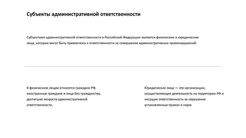Субъекты административной ответственностиСубъектами административной ответственности в Российской Федерации являются физические и юридические