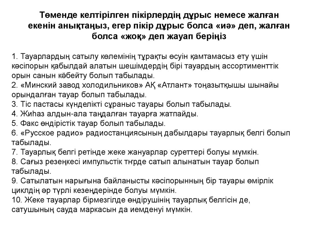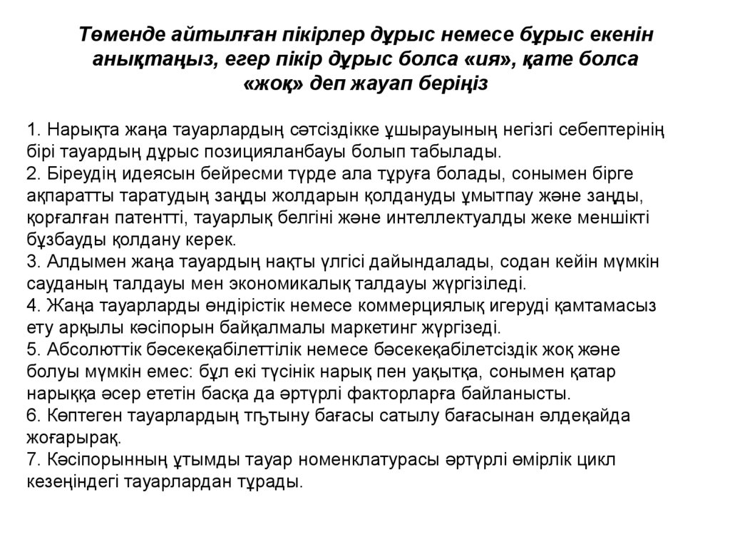 Төменде айтылған пікірлер дұрыс немесе бұрыс екенінанықтаңыз, егер пікір дұрыс болса «ия», қате болса