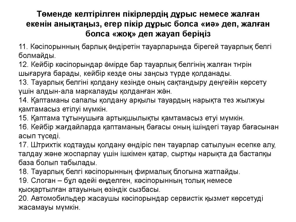 19. Слоган – бұл әдейі өңделген, кәсіпорынның толық немесе