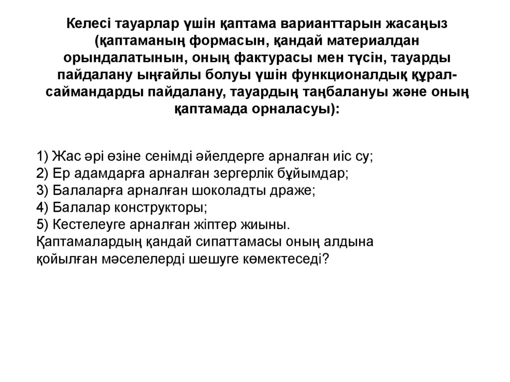Келесi тауарлар үшiн қаптама варианттарын жасаңыз(қаптаманың формасын, қандай материалдан