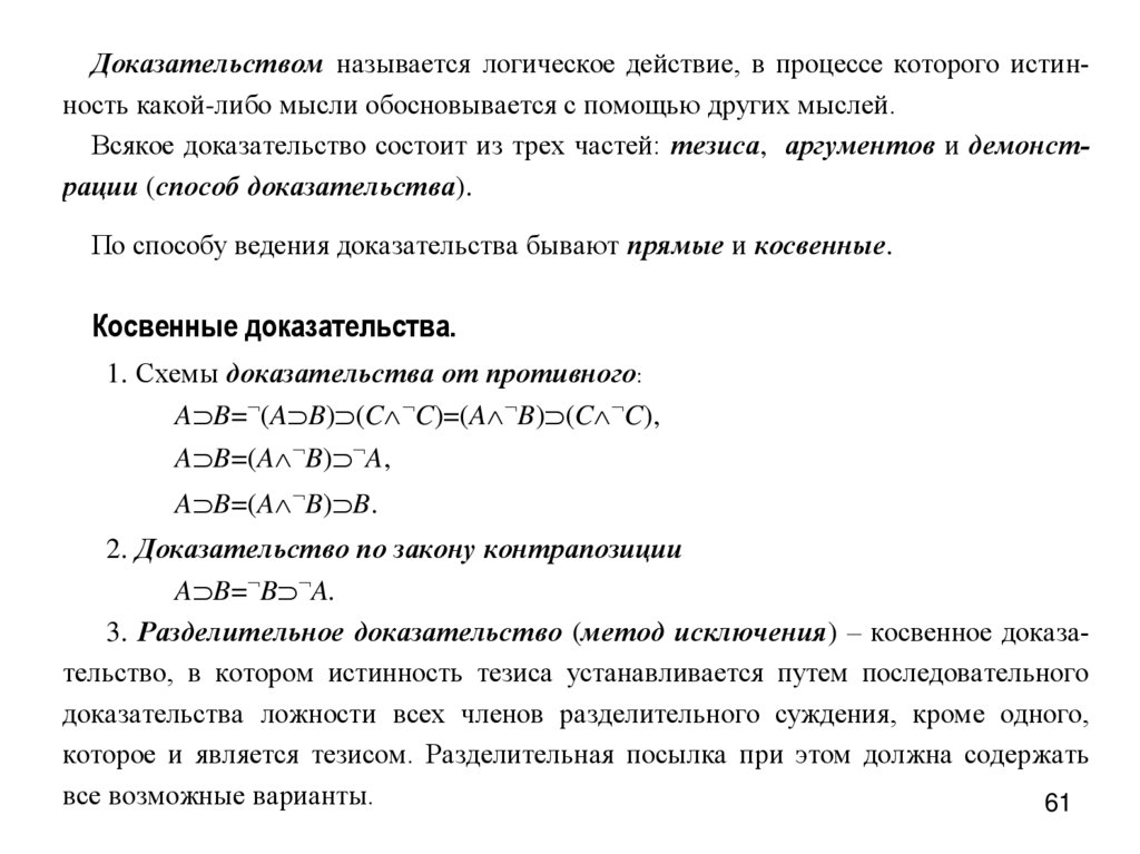 3. Разделительное доказательство (метод исключения) – косвенное доказательство, в котором истинность тезиса устанавливается путем последовательного