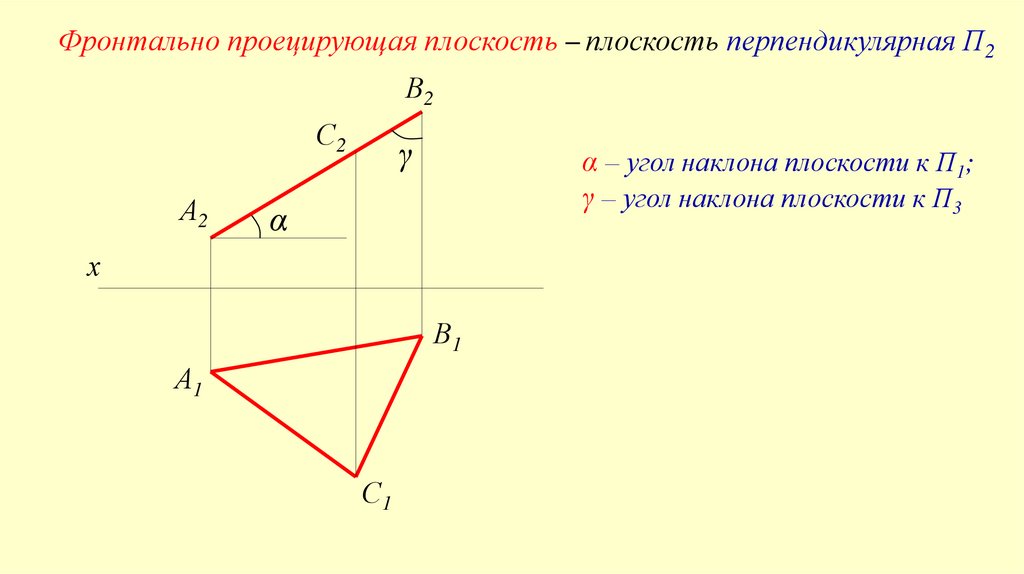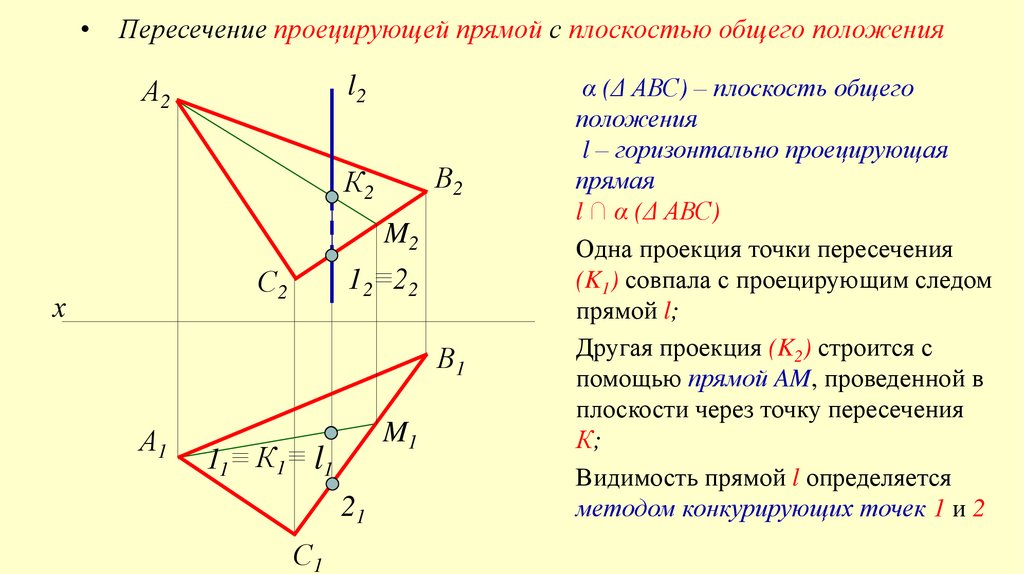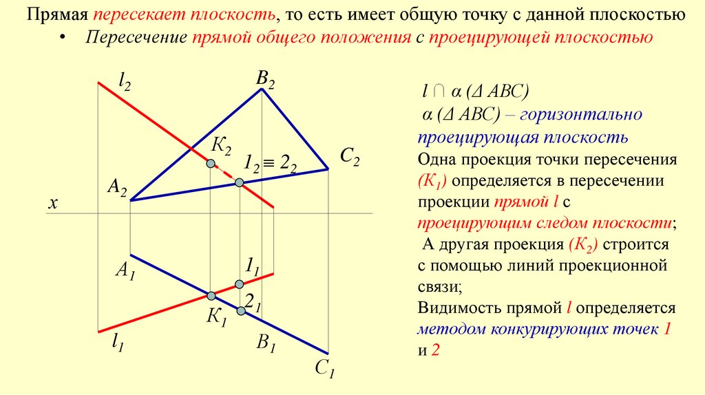 Прямая пересекает плоскость, то есть имеет общую точку с данной плоскостью• Пересечение прямой общего положения с проецирующей плоскостью