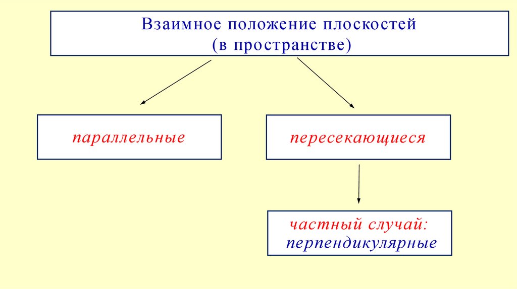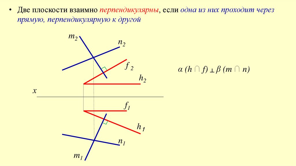 • Две плоскости взаимно перпендикулярны, если одна из них проходит черезпрямую, перпендикулярную к другой