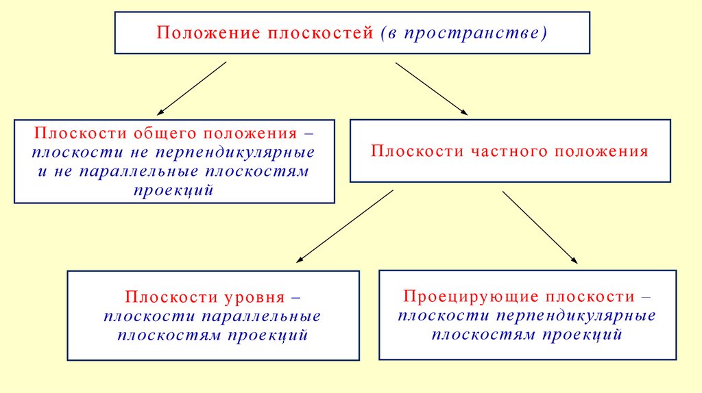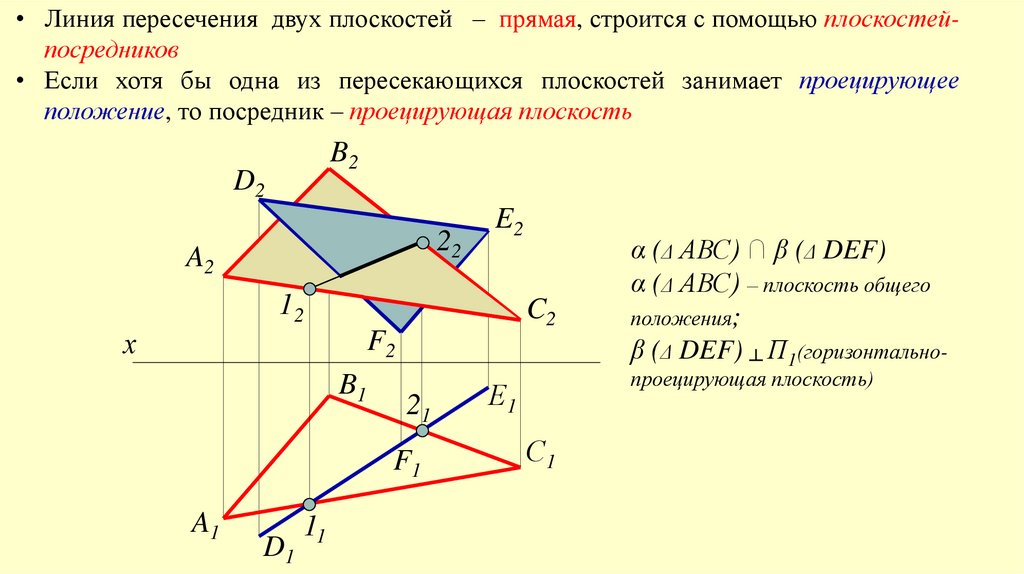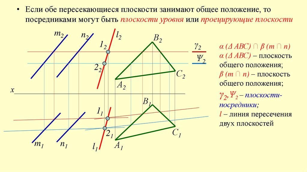 • Если обе пересекающиеся плоскости занимают общее положение, топосредниками могут быть плоскости уровня или проецирующие плоскости