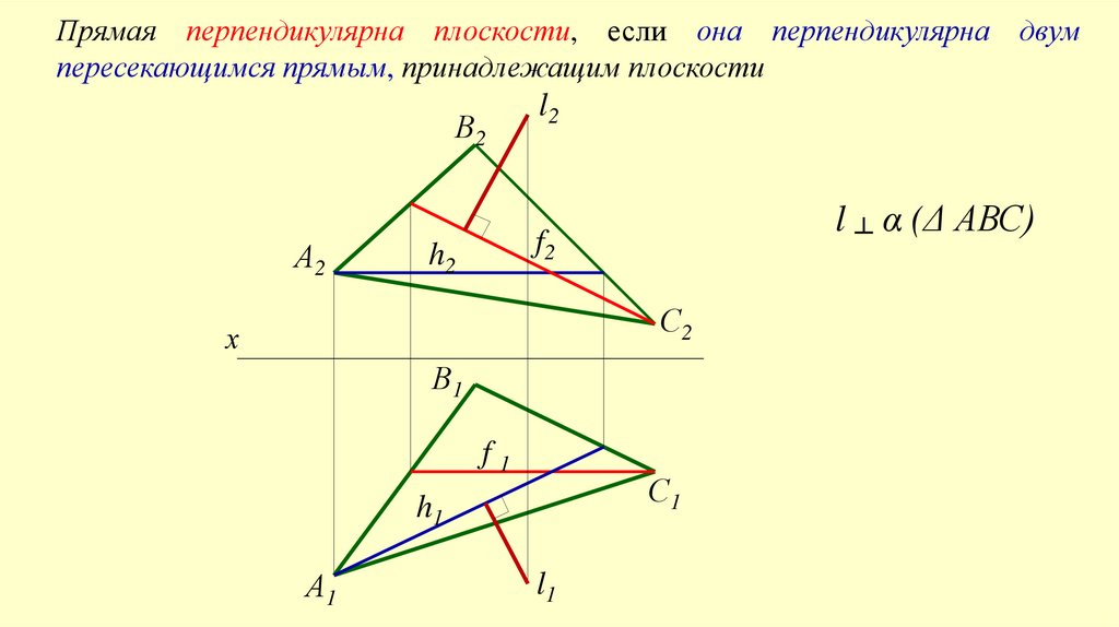 Прямая перпендикулярна плоскости, если она перпендикулярна двумпересекающимся прямым, принадлежащим плоскости