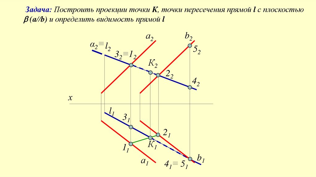 Задача: Построить проекции точки К, точки пересечения прямой l с плоскостью(а//b) и определить видимость прямой l