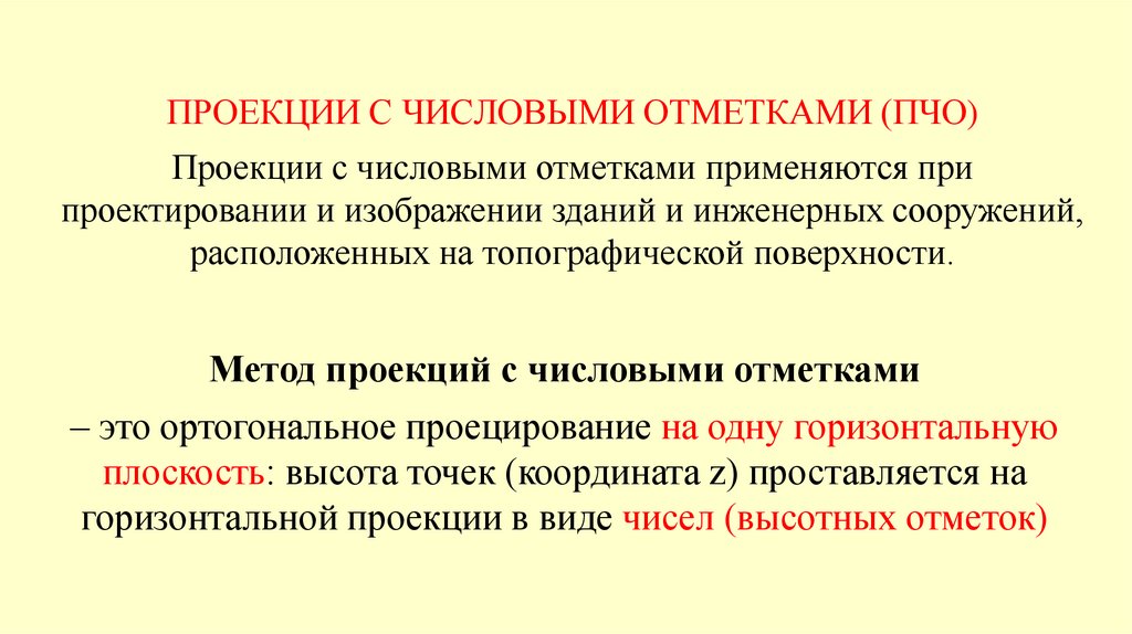 ПРОЕКЦИИ С ЧИСЛОВЫМИ ОТМЕТКАМИ (ПЧО)Проекции с числовыми отметками применяются при