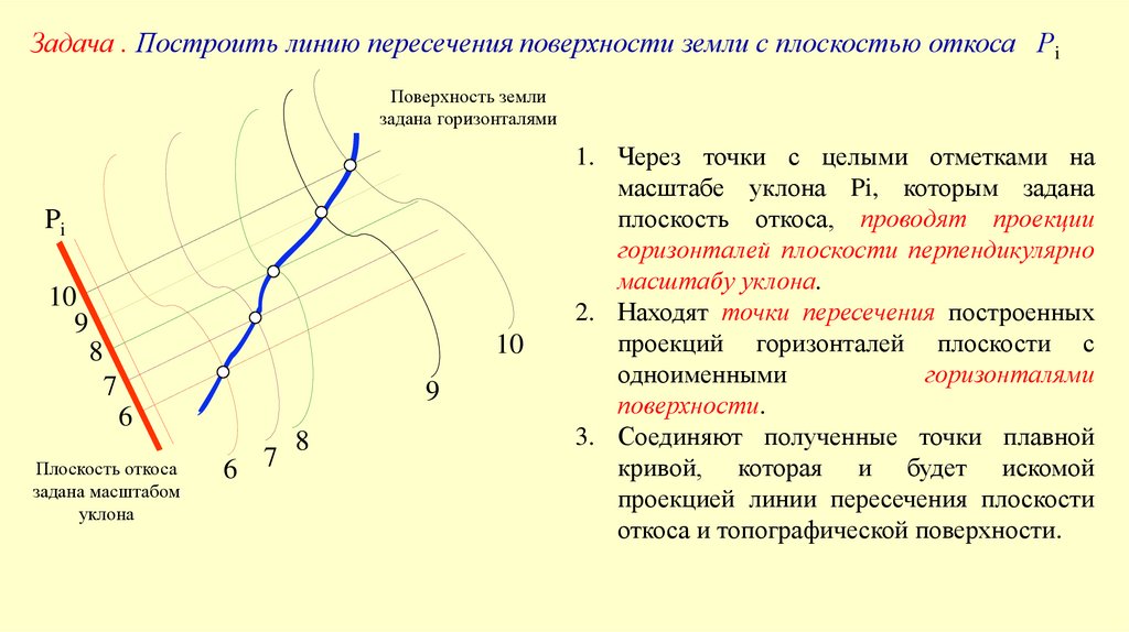 Задача . Построить линию пересечения поверхности земли с плоскостью откоса РiПоверхность земли
