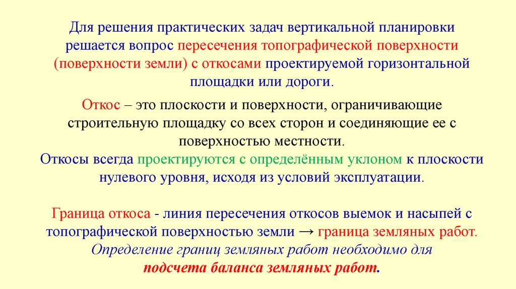Для решения практических задач вертикальной планировкирешается вопрос пересечения топографической поверхности