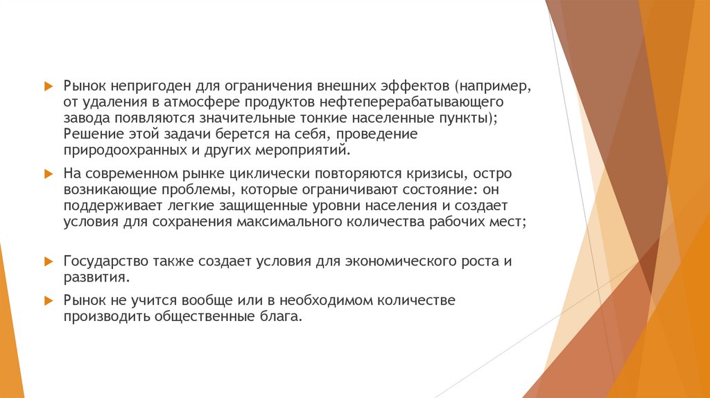 Рынок непригоден для ограничения внешних эффектов (например,от удаления в атмосфере продуктов нефтеперерабатывающего