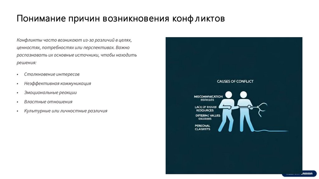 Понимание причин возникновения конф л иктовКонфликты часто возникают из-за различий в целях,