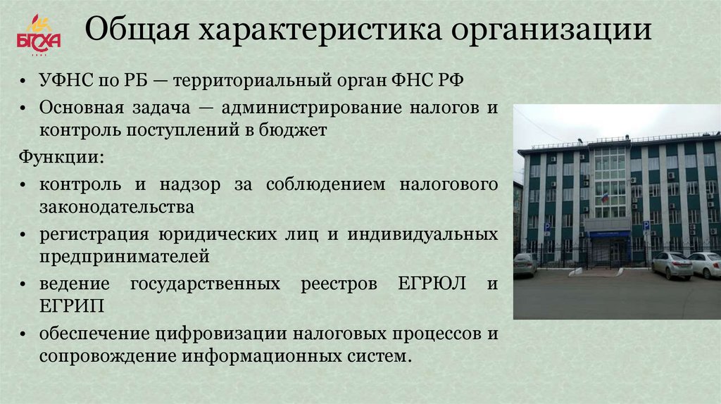 Общая характеристика организации• УФНС по РБ — территориальный орган ФНС РФ