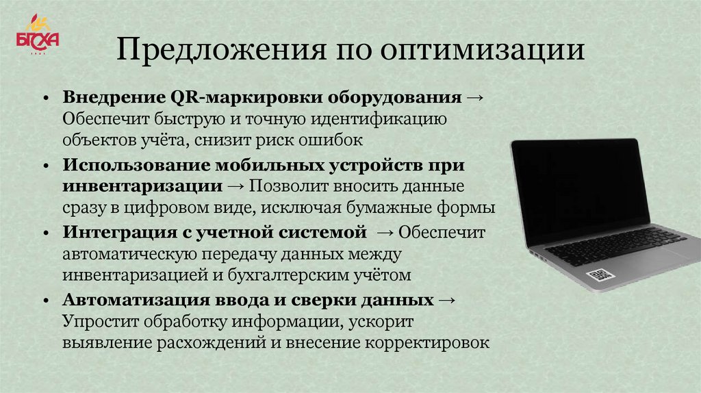 Предложения по оптимизации• Внедрение QR-маркировки оборудования →