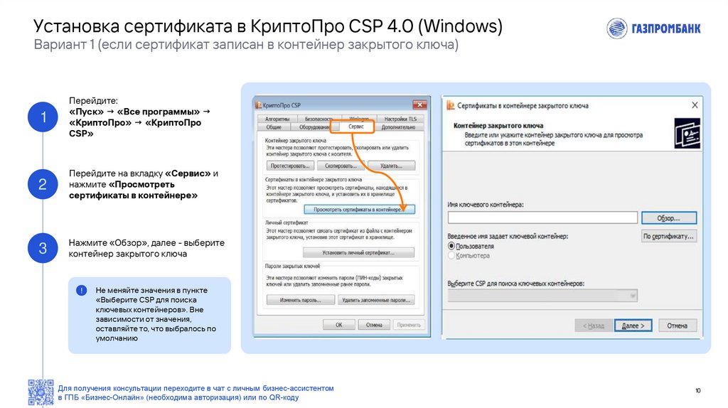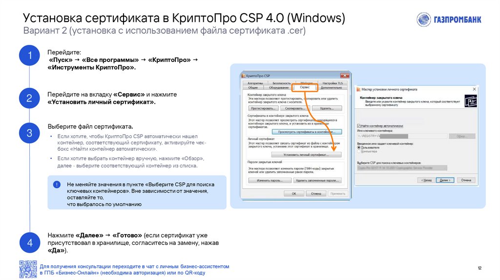 Установка сертификата в КриптоПро CSP 4.0 (Windows)Вариант 1 (если сертификат записан в контейнер закрытого ключа)