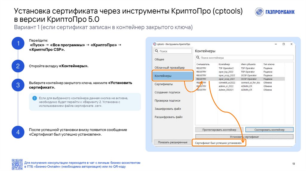 Вариант 1 (если сертификат записан в контейнер закрытого ключа)