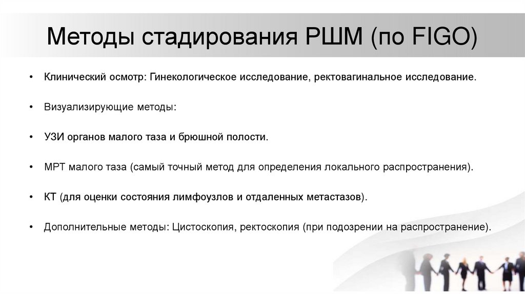 Методы стадирования РШМ (по FIGO)Клинический осмотр: Гинекологическое исследование, ректовагинальное исследование.