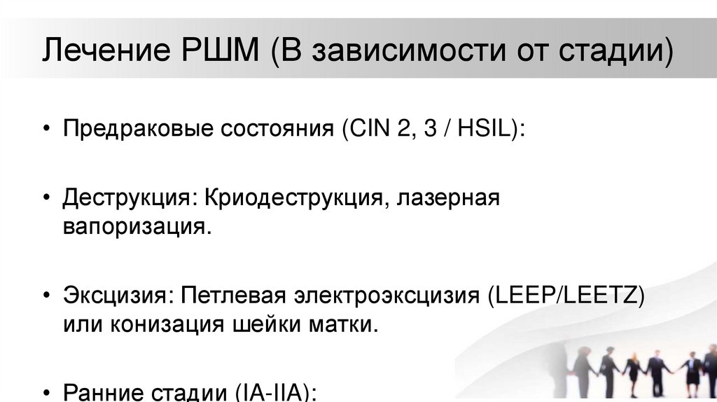 Лечение РШМ (В зависимости от стадии)• Предраковые состояния (CIN 2, 3 / HSIL):
